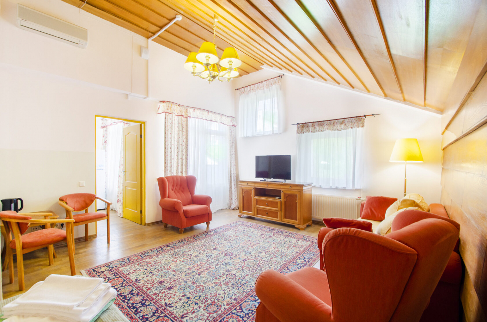 2 осн. места. 3 доп. места. Мебель: вешалка, диван, зеркало, кровать двуспальная, прикроватные тумбочки, стол, стулья, шкаф. Оборудование: кондиционер, телевизор, холодильник, электрочайник. Санузел: с душем, туалетные принадлежности, фен. Сервис: Wi-Fi бесплатно, смена полотенец, смена постельного белья, уборка номера.