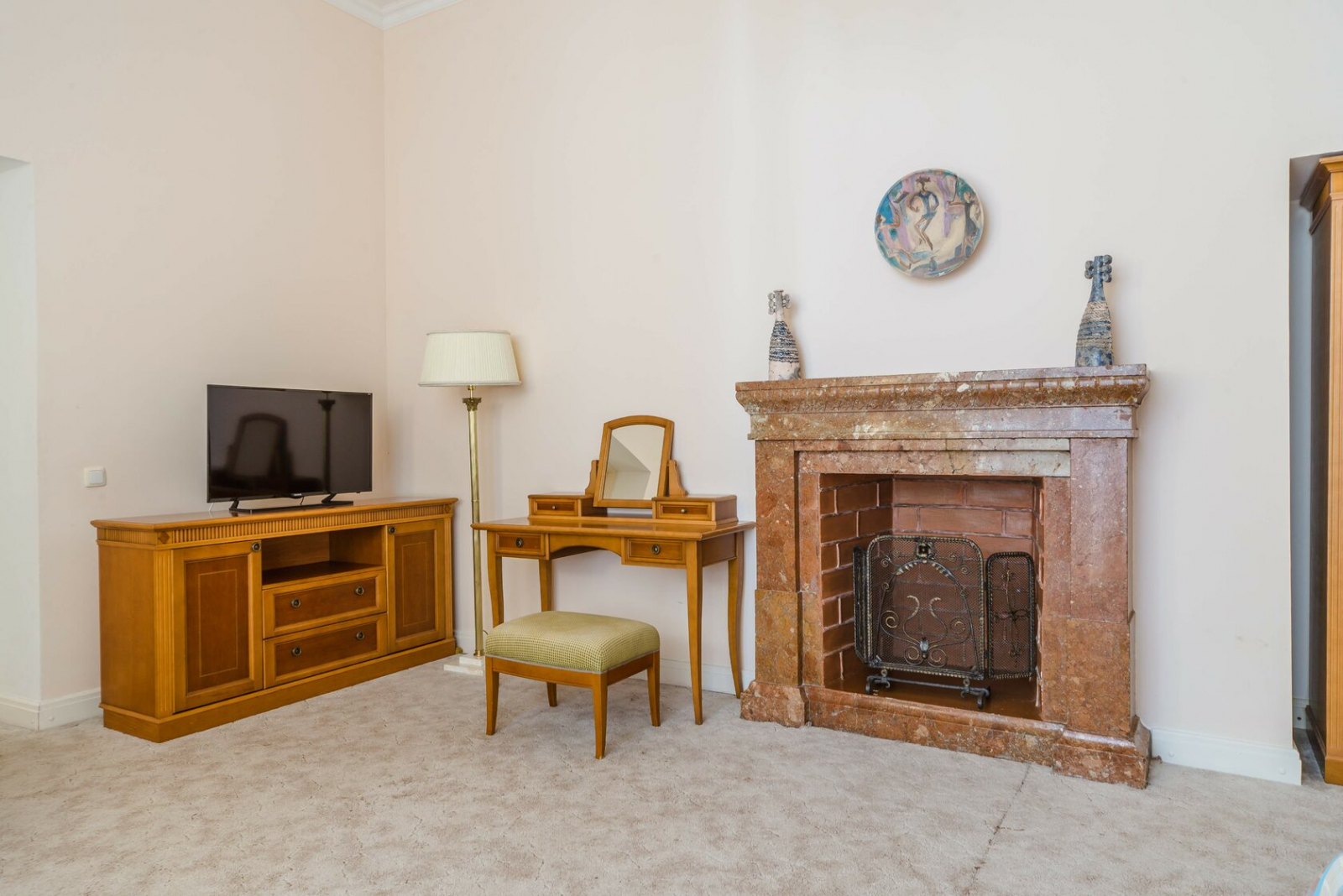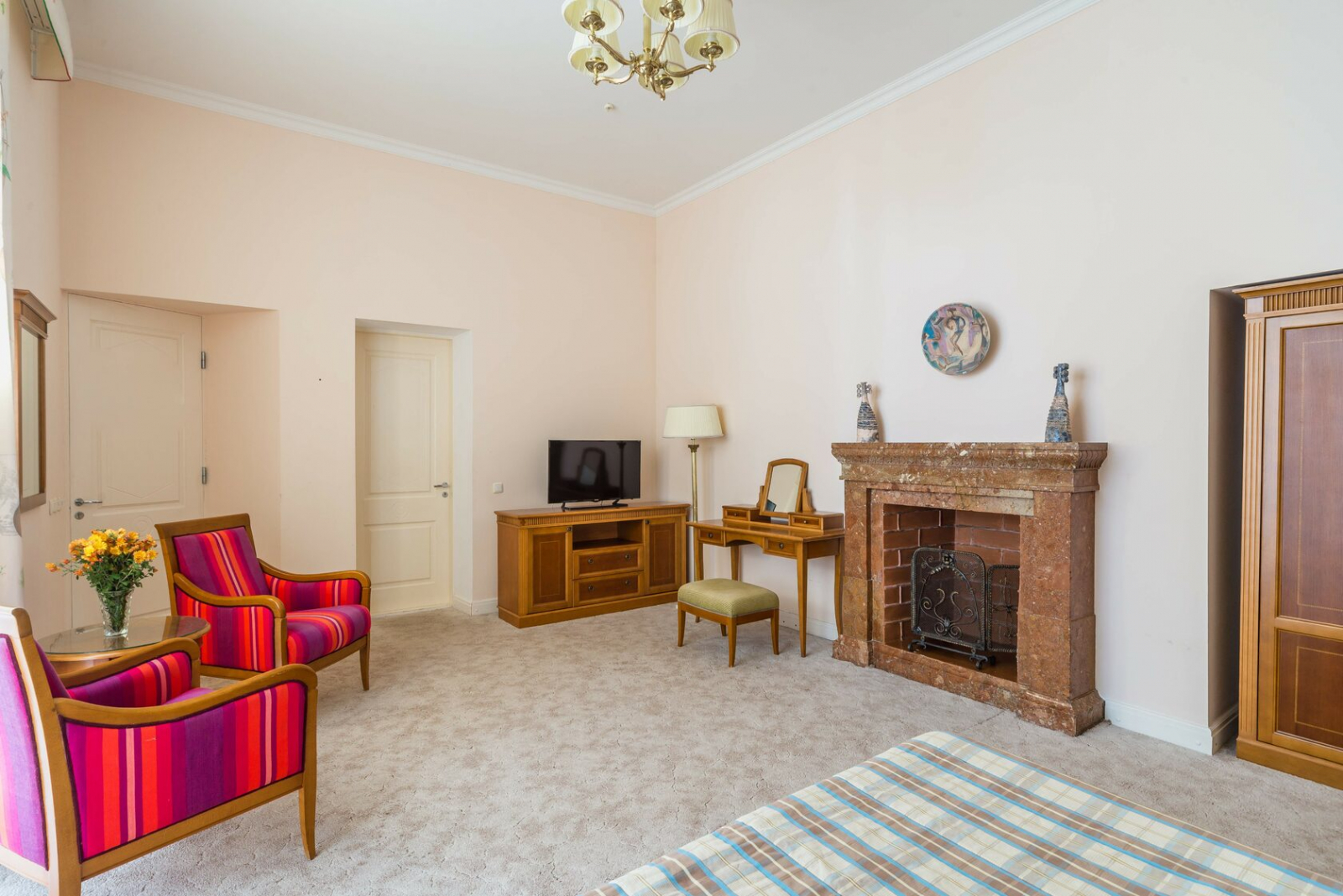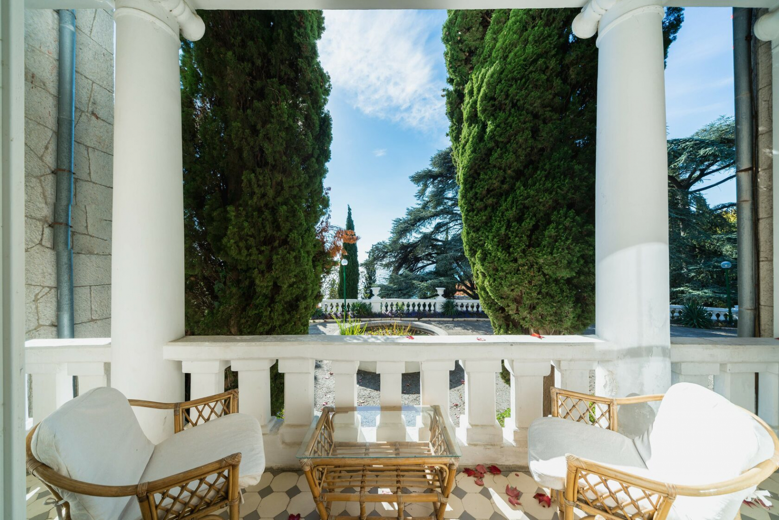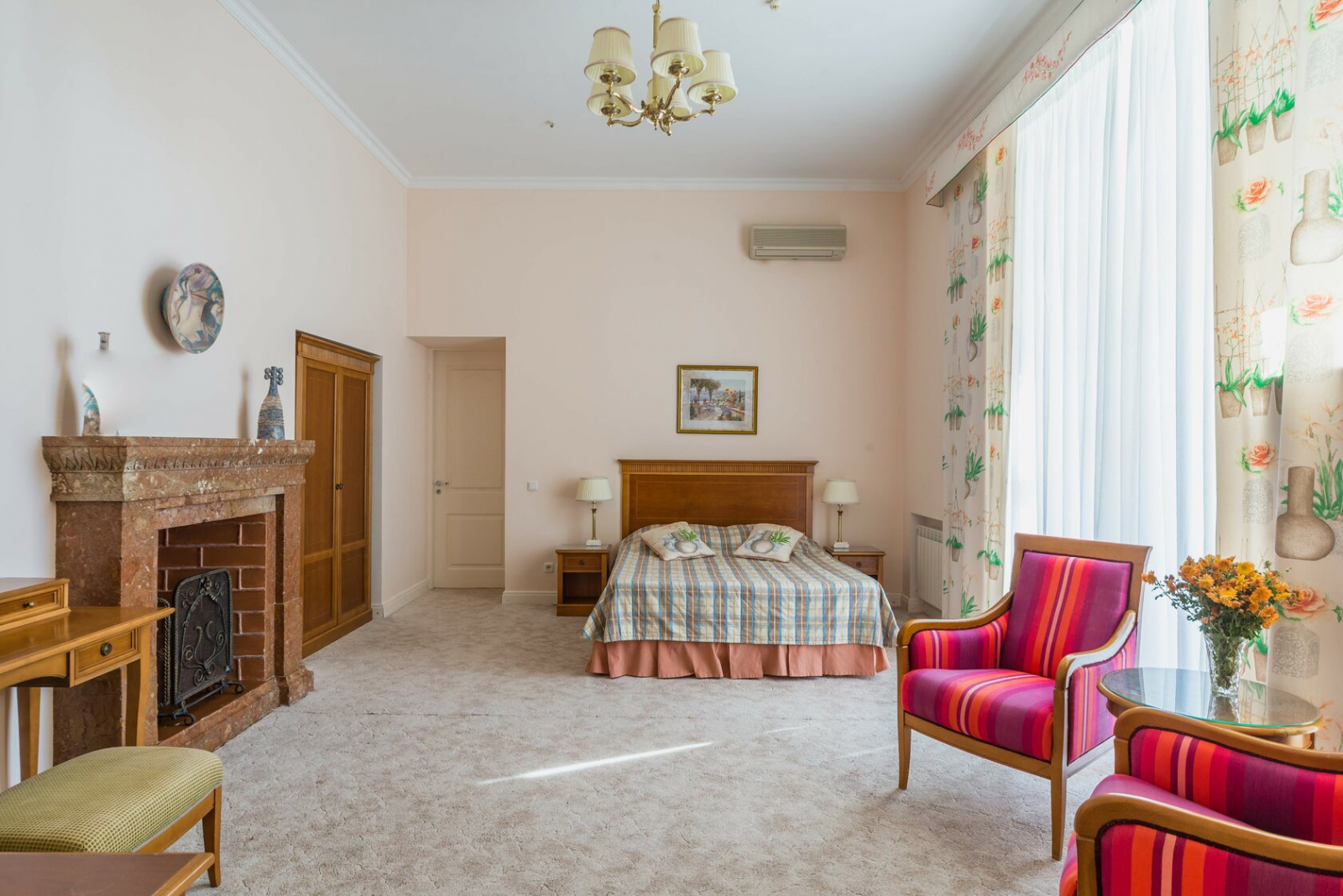 VIP номер с камином и балконом, расположенные в здании исторической усадьбы XX века, с прекрасным видом на парковую зону и море, в номере одна просторная комната с двуспальной кроватью и прикроватными тумбами, телевизор, холодильник, кондиционер, журнальный и кофейный столики, кресла, фен, сейф. Большая ванная комната. На балконе плетёная ротанговая мебель. Номер имеет индивидуальную систему кондиционирования.