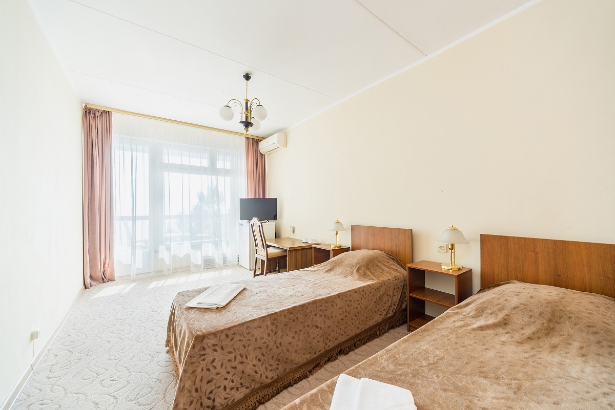 Площадь номера - 20-27 кв.м. 2 осн. места. 1 доп. место. Балкон. Мебель: вешалка, зеркало, кровати односпальные, прикроватные тумбочки, столик туалетный, стул, тумба под телевизор, шкаф. Оборудование: кондиционер, сейф, телевизор ЖК, холодильник. Санузел: с душем, туалетные принадлежности, фен, халат. Сервис: Wi-Fi бесплатно, смена полотенец, смена постельного белья, уборка номера.